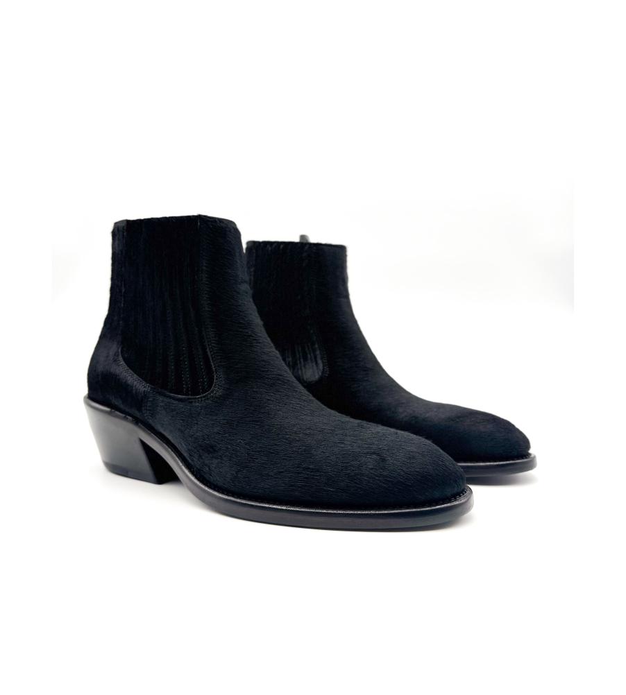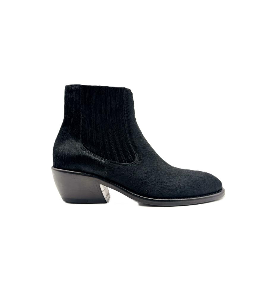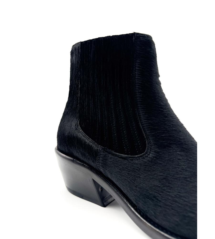 Bottines à élastiques en cuir et poil noir avec un talon biseauté